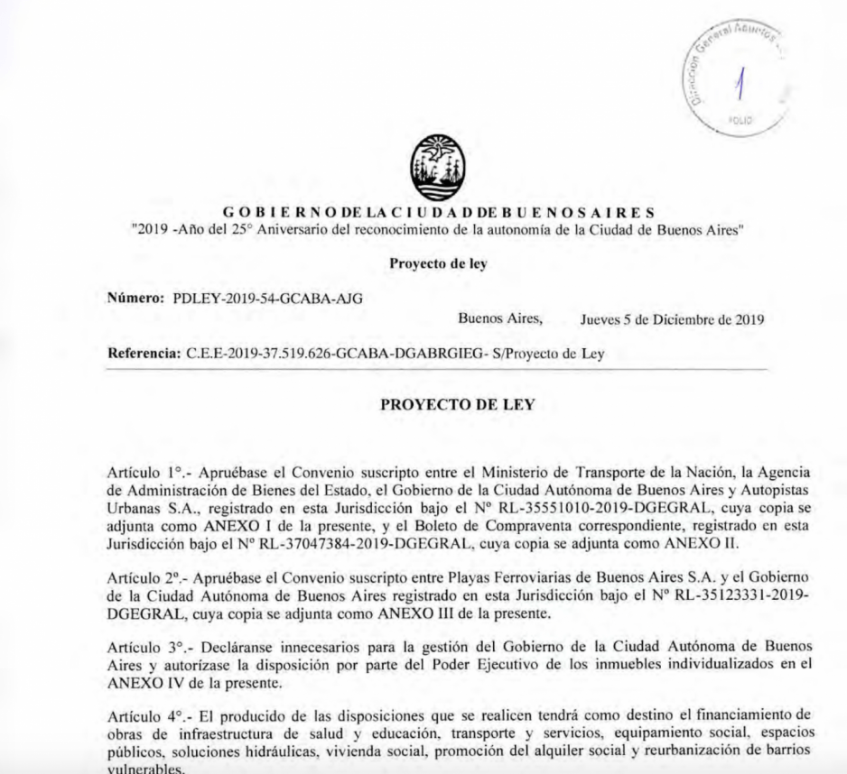 Apurados por el cambio de gobierno, desde el macrismo armaron dos paquetes de transferencias de bienes. El aprobado incluía terrenos top en Retiro, Colegiales y Villa Urquiza por un valor de 8500 millones de pesos para cubrir el costo de los viaductos. El otro quedó sin votar y se refería a playas de maniobra de los ferrocarriles en Palermo y Caballito.