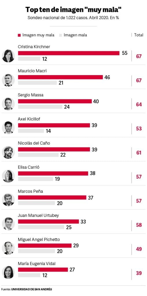 El top ten negativo lo cierran dos referentes de Juntos por el Cambio. Miguel Angel Pichetto (con 29% de «muy mala») y Vidal (con 27%). El cambio más brusco fue el de la ex gobernadora, protagonista estrella de todos los ranking de imágenes en los primeros años del Gobierno de Macri, pero arrastrada también por el derrumbe de ese proyecto. Lo del ex senador sorprende menos, ya siempre prevaleció el rojo en sus mediciones. Respecto a enero, hay una leve mejora de la ex gobernadora.