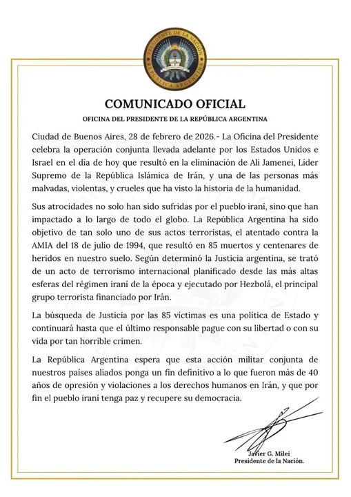 La posición oficial del Gobierno argentino se expresó a través de declaraciones públicas en las que se respaldó la ofensiva militar contra el régimen iraní y se subrayó la necesidad de enfrentar lo que consideran amenazas a la estabilidad internacional.