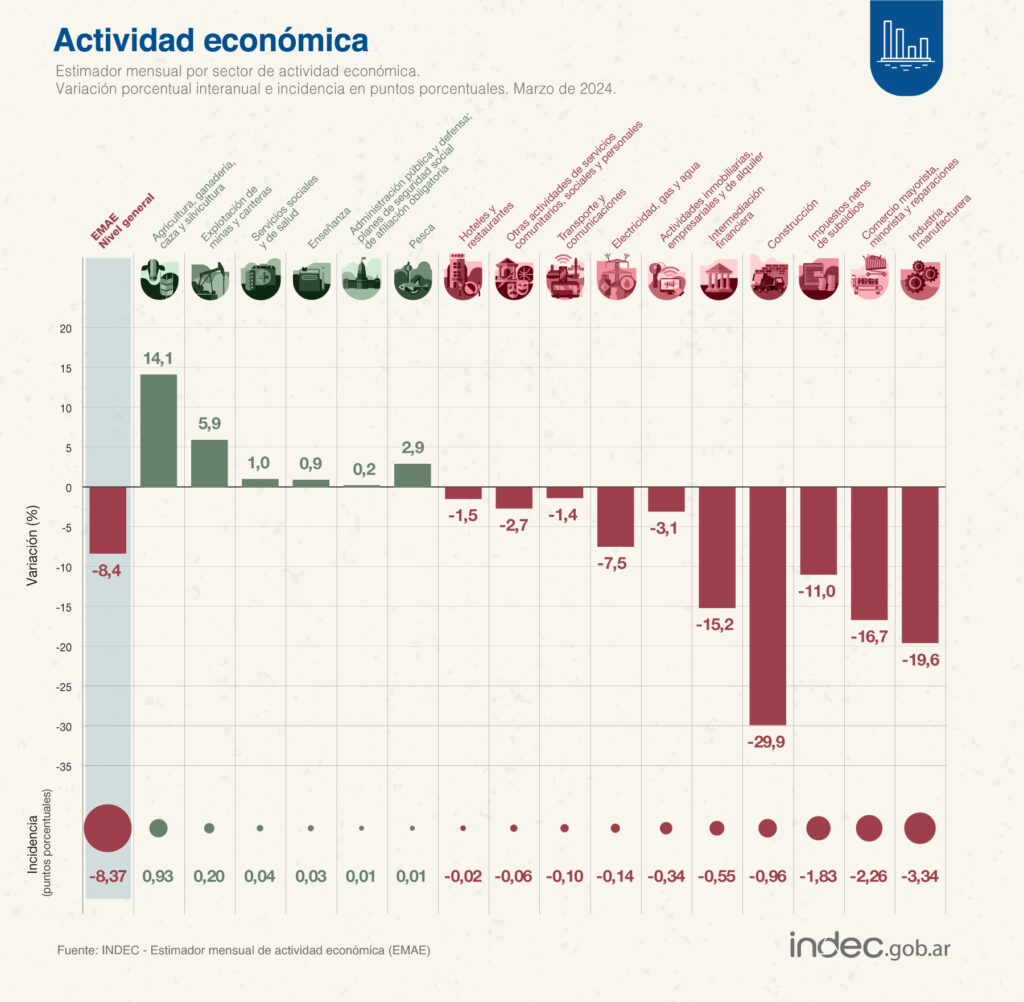 “En marzo de 2024, el Estimador mensual de actividad económica (EMAE) registró una caída de 8,4% en la comparación interanual y de 1,4% respecto a febrero en la medición desestacionalizada”, informó el Instituto Nacional de Estadística y Censos (Indec)