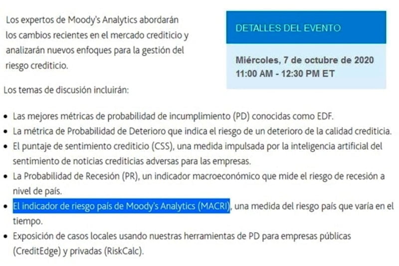 La calificadora de riesgo Moody’s desarrolló un indicador para medir el riesgo país a lo largo del tiempo y no tuvo mejor idea que llamarlo «MACRI». En una charla agendada para el próximo 7 de octubre que versará sobre «La siguiente generación en señales de alerta temprana crediticias», la calificadora va a presentar el indicador. Si bien Moody´s no lo aclara, seguramente «MACRI» sea una sigla en inglés (¿será Moody´s Analytics Countries Risk Index?) , aunque es imposible no relacionarlo al ex presidente, cuya gestión hizo que el índice de riesgo país volviera a estar en todas las pantallas de televisión.